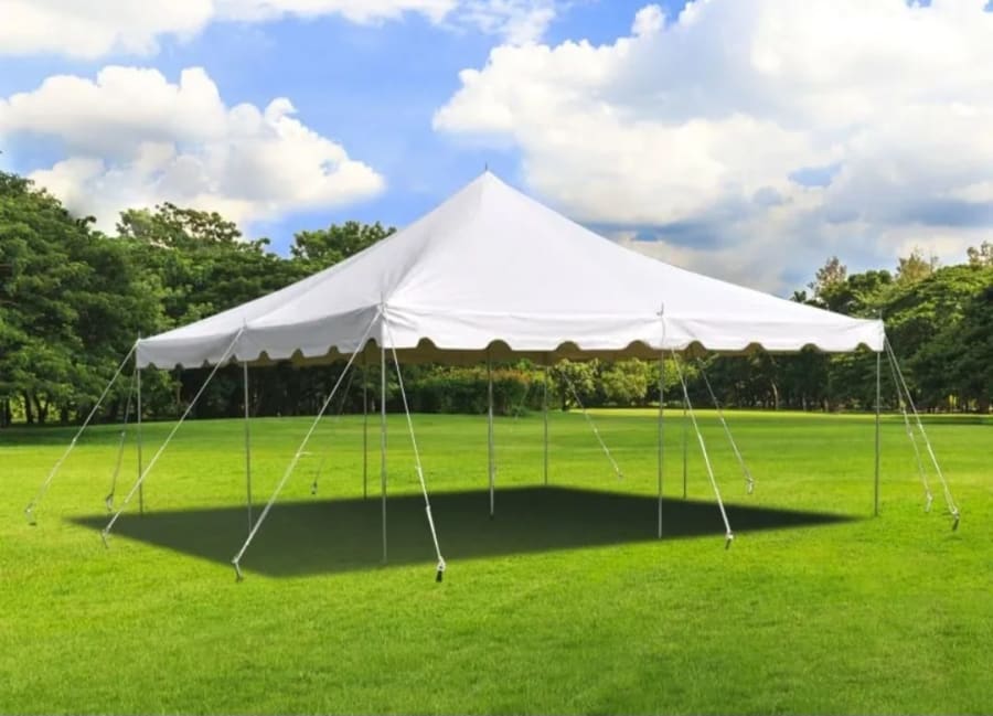Rent a 20'X20' Poll Tent for weddings, festivals, corporate events, and backyard parties. This white poll tent combines timeless style with reliable shelter. Ideal for attendees who want an elegant peak canopy and an open, airy footprint. Use our tent rentals to elevate your event quickly and affordably.